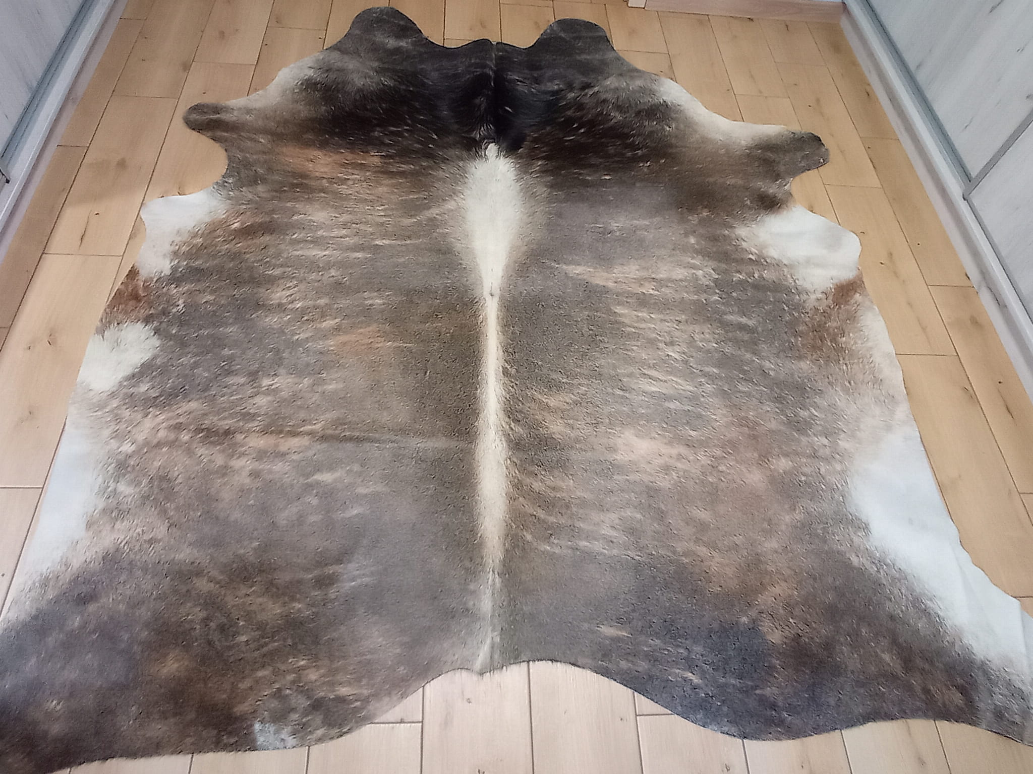 Ten spektakularny dywan ze skóry bydlęcej typu "GIGANT" o wymiarach 220x215 cm to rzadki okaz dla koneserów. Połączenie imponującego rozmiaru (format XXL) z modnym, szaro-brązowo-czarnym ubarwieniem czyni go unikatem na skalę europejską.
