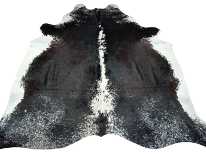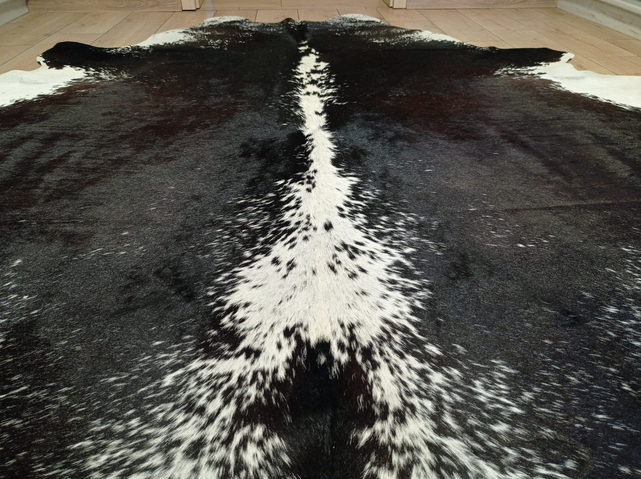 Ten spektakularny dywan ze skóry bydlęcej typu "GIGANT" o wymiarach 230x220 cm to rzadki okaz dla koneserów. Połączenie imponującego rozmiaru (format XXL) z modnym czarno-brązowo-białym ubarwieniem (styl TRICOLOR) czyni go unikatem na skalę europejską.
